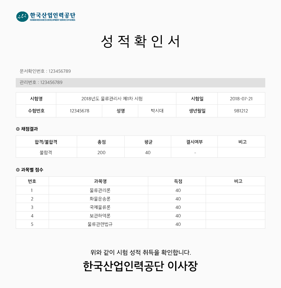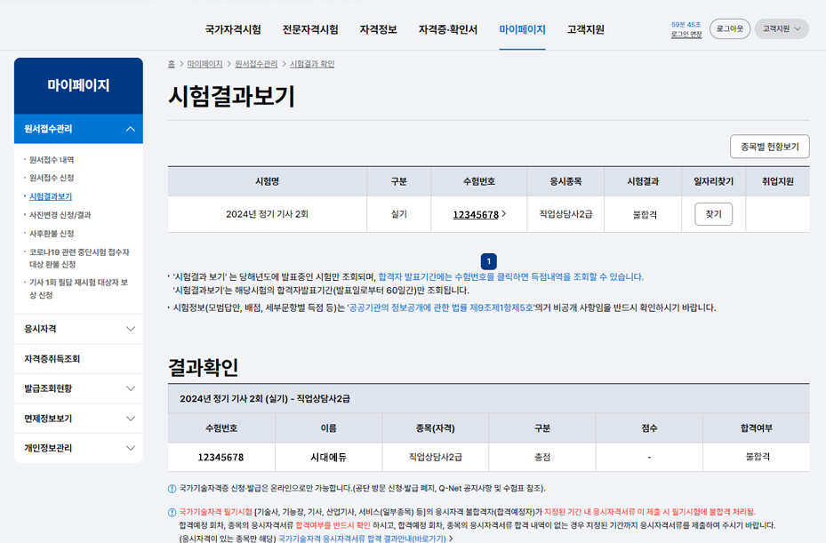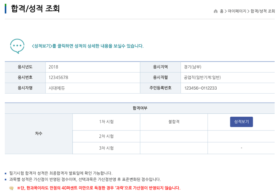 시험응시 > 불합격 증명서 제출 > 서류심사 > 기간연장